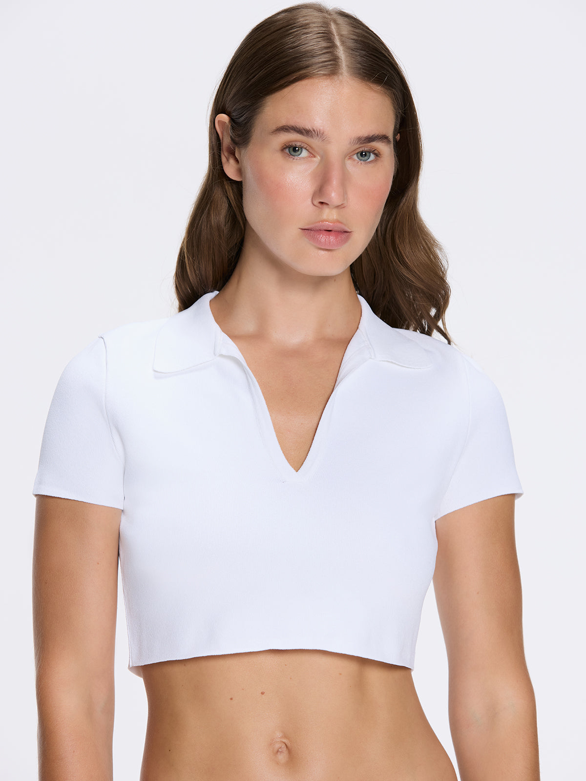 The Shandy White Polo Collar Knitted Crop Top is a standout piece from our SS26 women's ready-to-wear and women's knitwear tops collection. Designed with a polo-style open neckline, short sleeves, and a fitted cropped silhouette, this women's knitted crop top perfectly balances modern elegance with effortless comfort. Ideal for vacation dressing, yacht escapes, or city chic styling, it pairs beautifully with high-waisted pants, skirts, or layered over swimwear for versatile resort looks. Crafted for women who value refined resortwear tops and timeless style.