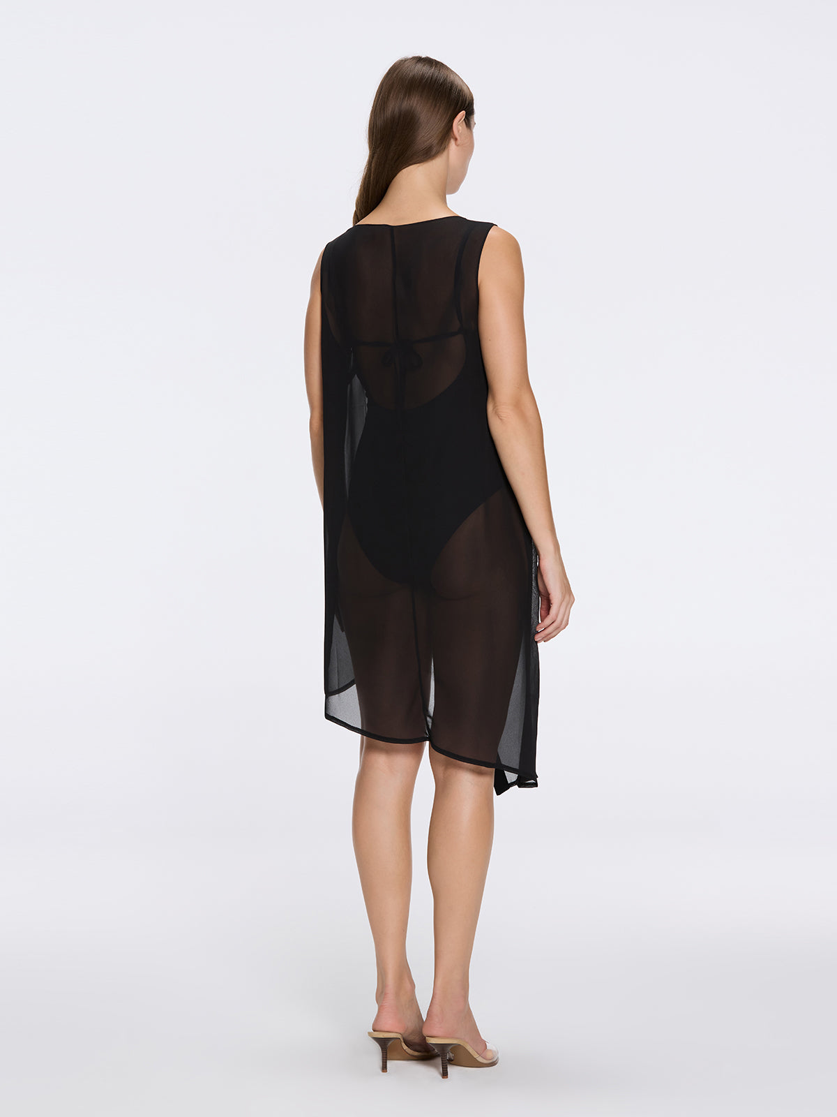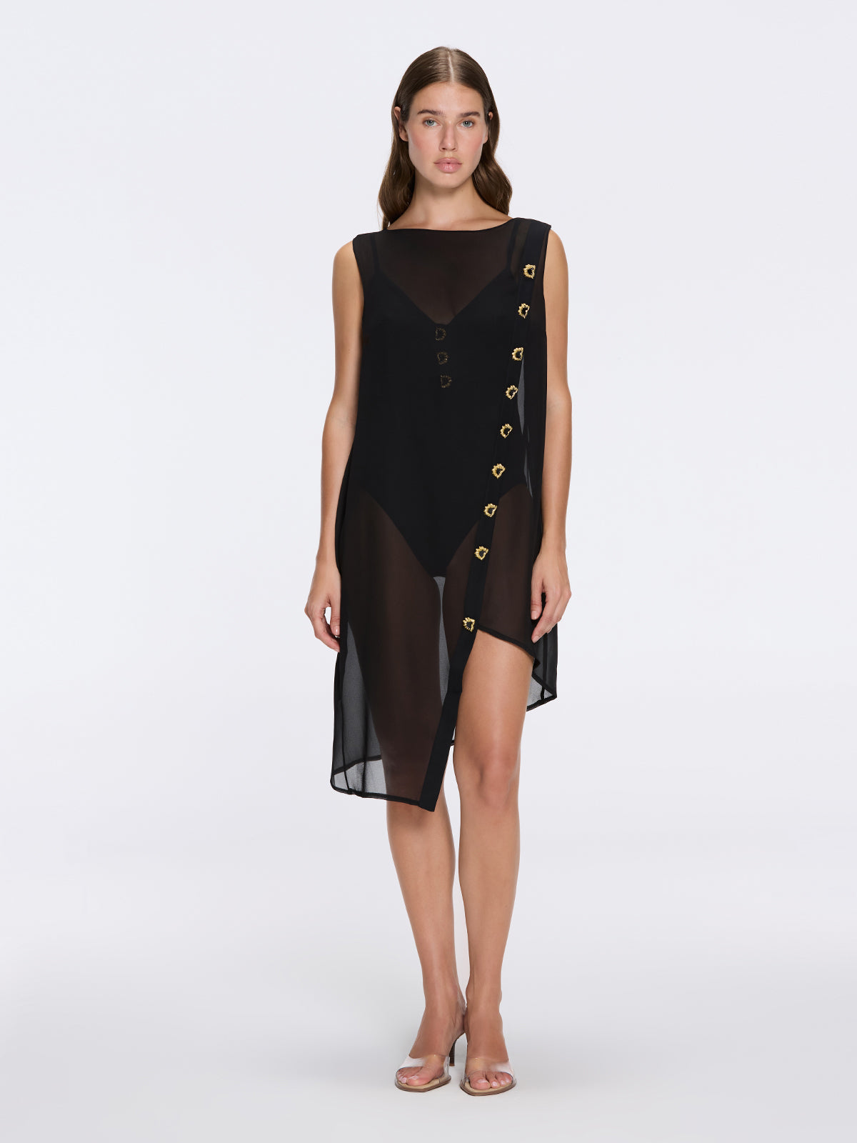 Elevate your resort wardrobe with the Solianne Black Sheer Sleeveless Asymmetric Dress with Gold Button Detail, a sophisticated piece designed for women who value modern elegance and refined craftsmanship. This lightweight sheer asymmetric dress combines fluid movement with striking architectural details, making it perfect for daytime beach moments or elegant evening occasions.
