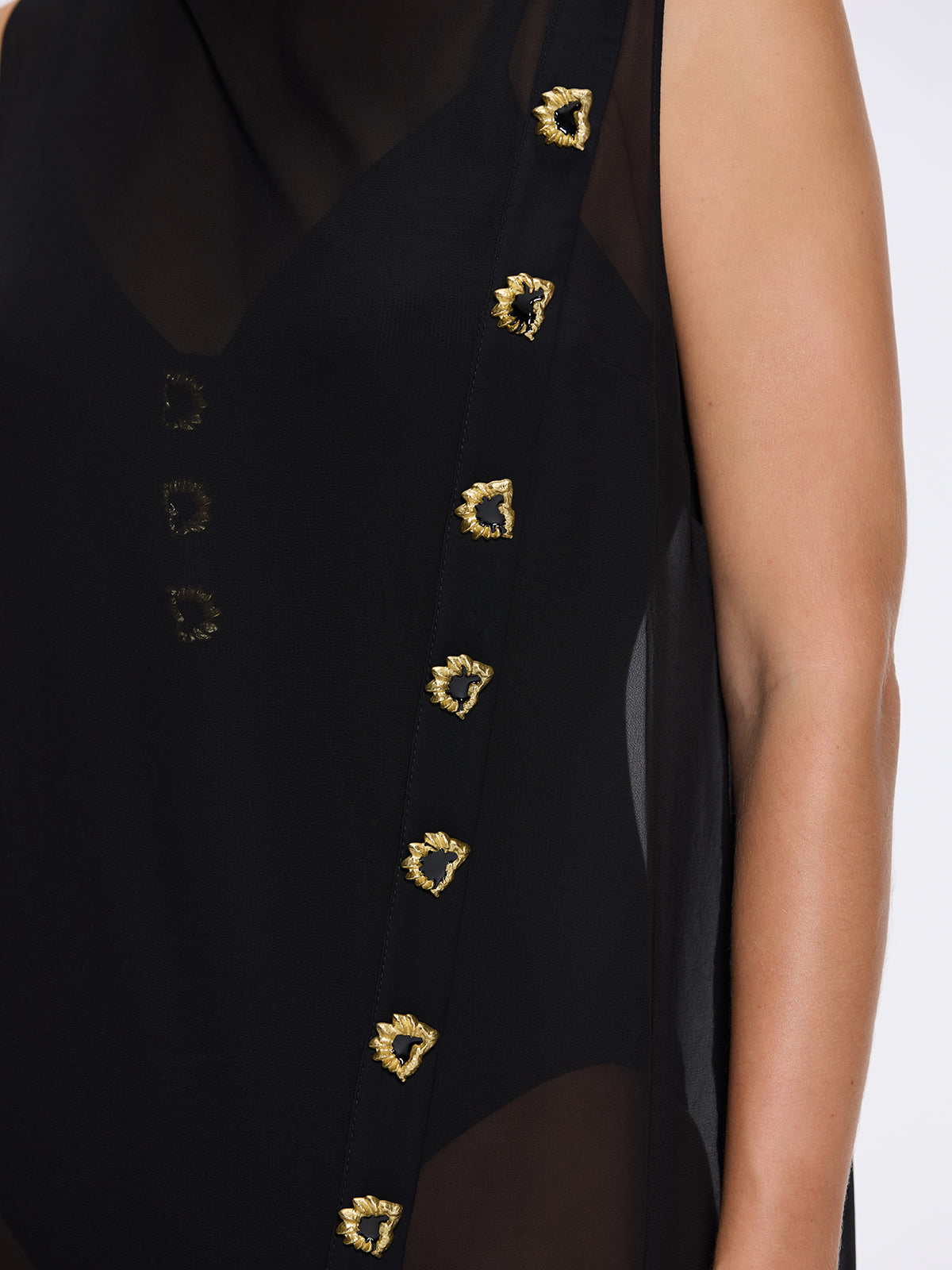 Solianne Black Sheer Sleeveless Asymmetric Dress with Gold Button Detail