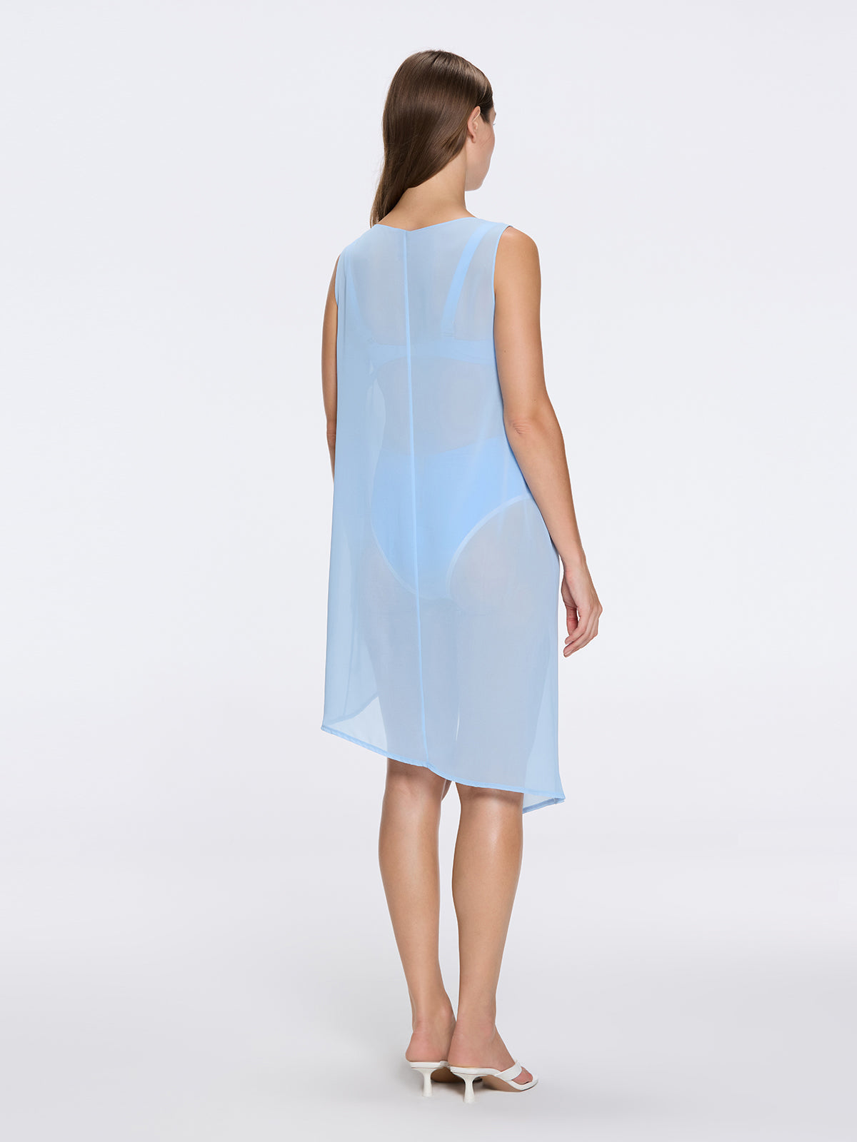 Embrace contemporary luxury with the Solianne Blue Sheer Sleeveless Asymmetric Dress with Gold Button Detail, a standout piece designed for women who appreciate refined resortwear, modern silhouettes, and timeless craftsmanship. This elegant sheer asymmetric dress blends lightweight fluidity with sculptural detailing, making it the perfect choice for sun-soaked escapes and elevated evening moments.