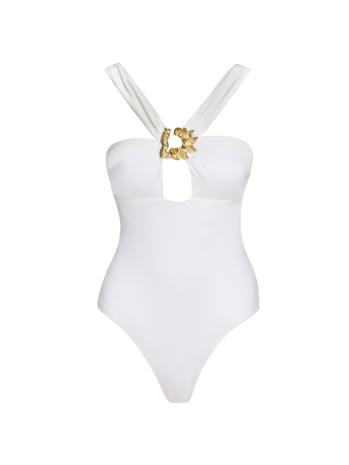 Elevate your summer style with the Talia V Neck with Gold Detail Satin White Swimsuit, a luxurious and refined one-piece designed for women who value elegance, comfort, and confidence. Crafted from premium satin Italian fabric, this white V-neck swimsuit features a halterneck silhouette, flattering cut-out details, and a sculpted gold accessory for a polished, resort-ready look. Fully lined with removable cups, it offers support and comfort from poolside lounging to beachside strolls.