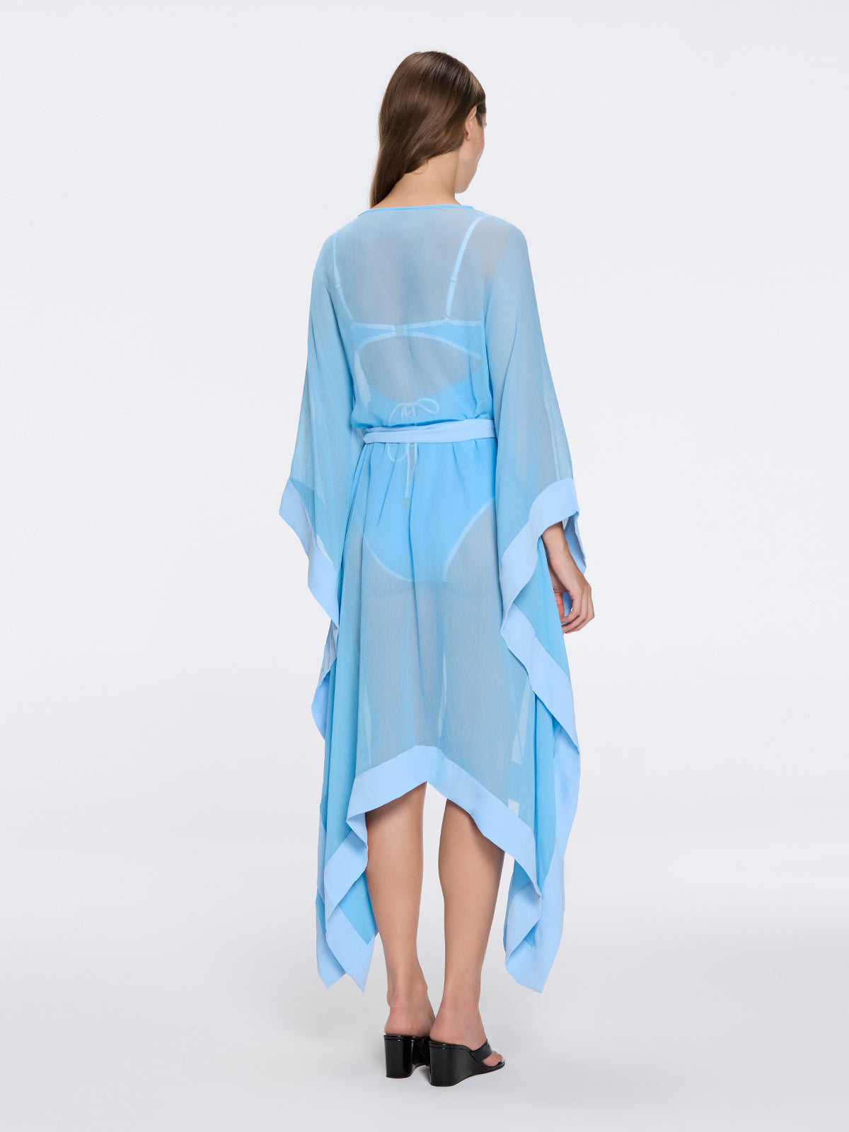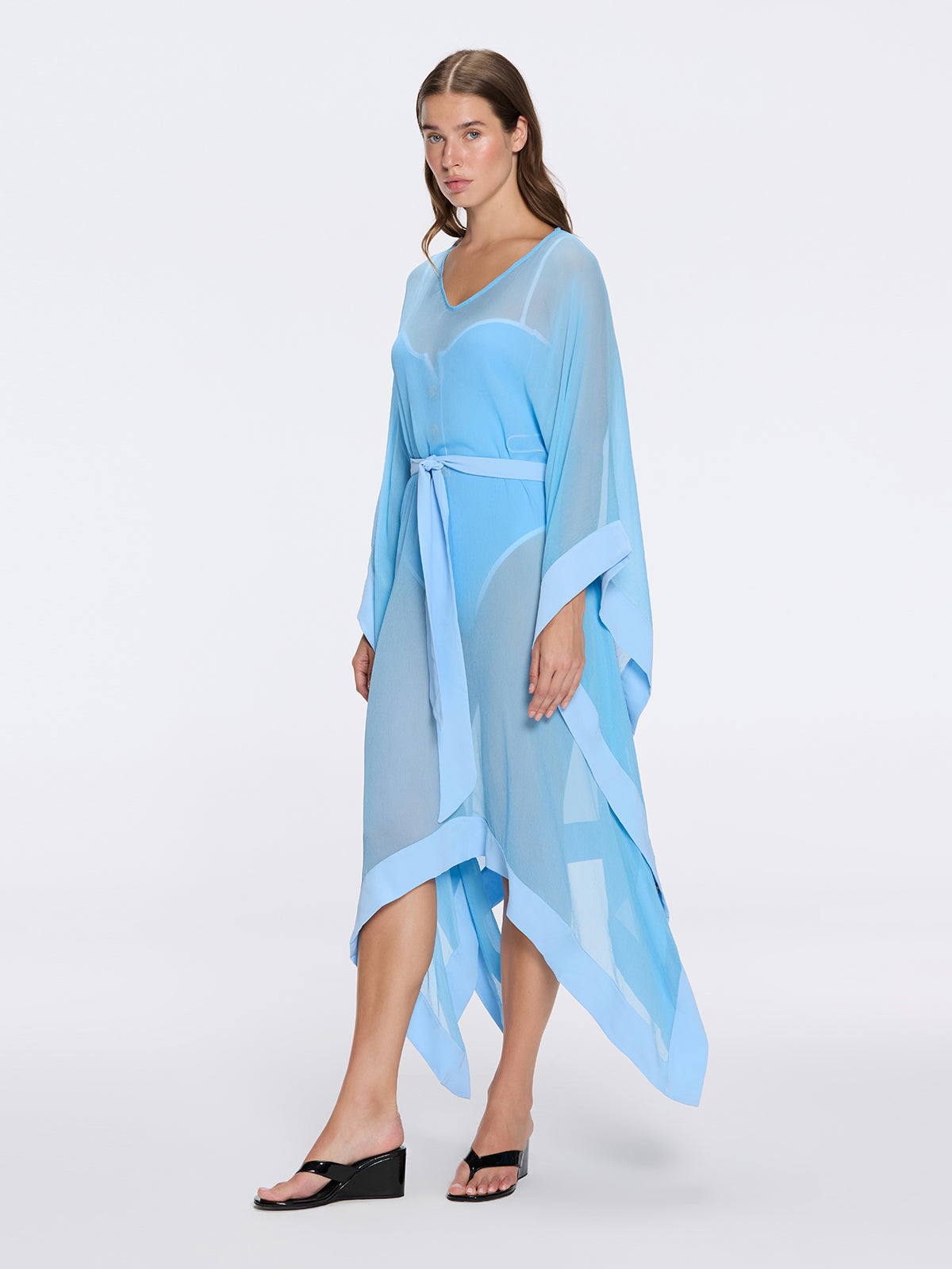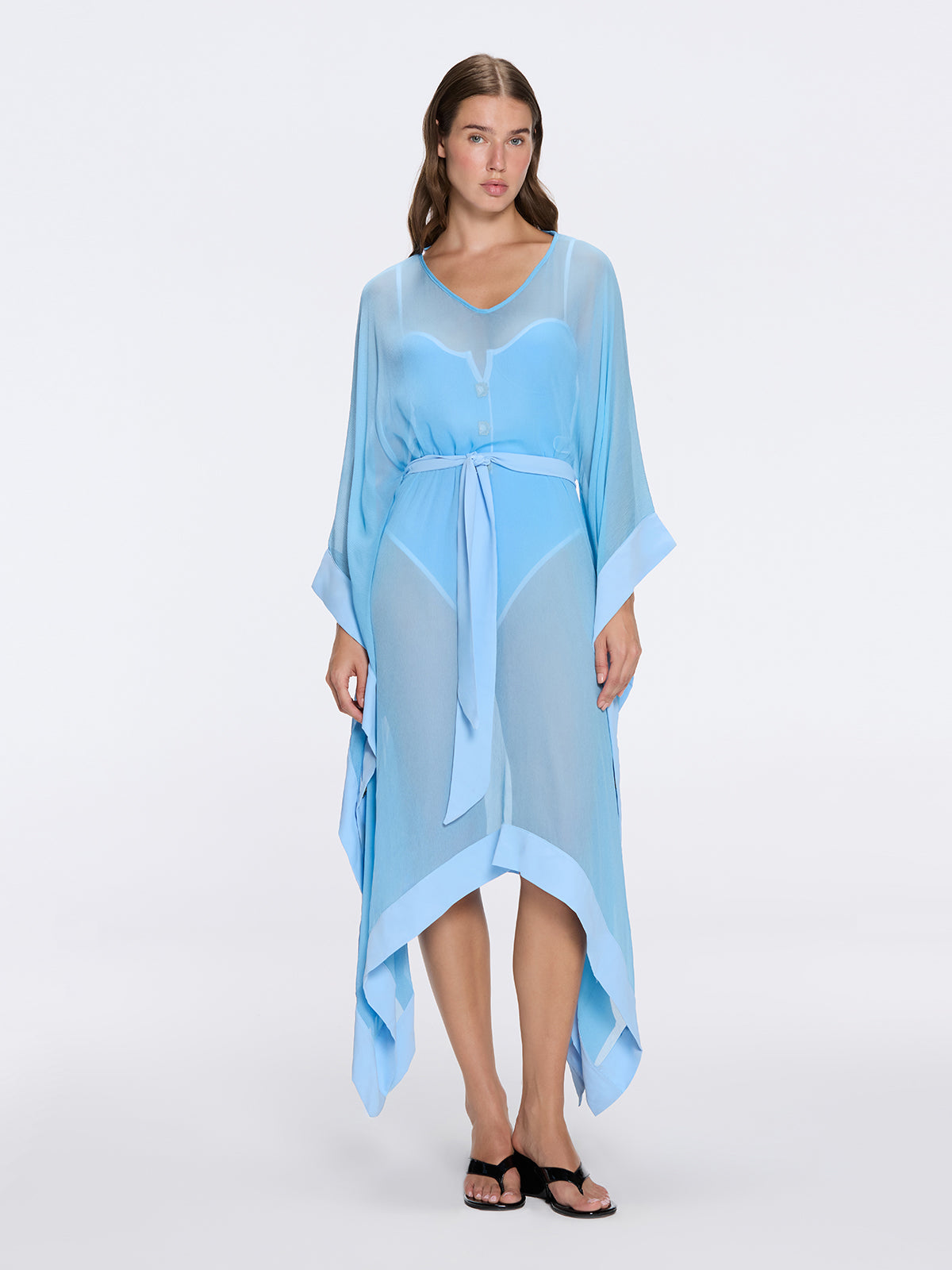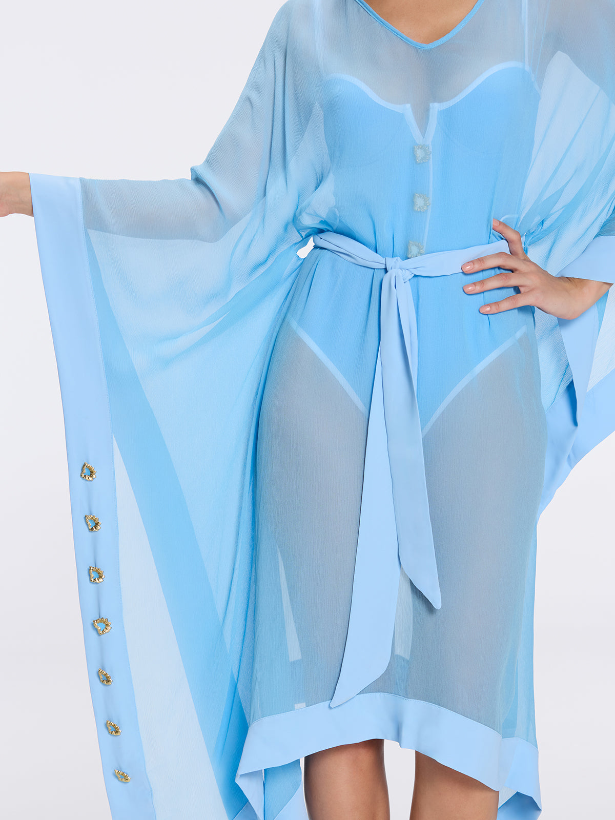 Elevate your resort style with the Tata Blue Sheer Gold Buttoned Belted Kaftan with Asymmetric Hem  a refined statement from our SS26 collection. Designed to flatter and perform, it features v neckline, knee length silhouette, detachable self-tie belt, poncho style wide sleeves, gold button details, sheer fabric, delivering confident comfort and ease of movement from seaside strolls to sunset cocktails. The fluid silhouette moves gracefully while premium fabrication feels soft against the skin and holds its shape wear after wear. Pair with coordinating swimwear or a lightweight blouse for an effortless day-to-evening transition. Whether relaxing on the coast or attending a beachside soirée, the Tata Blue Sheer Gold Buttoned Belted Kaftan with Asymmetric Hem embodies timeless elegance and modern ease. Crafted for the discerning traveler who values quality, fit, and style.