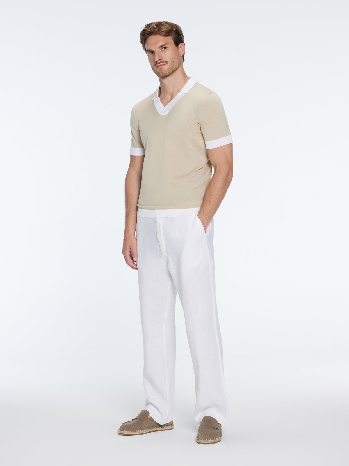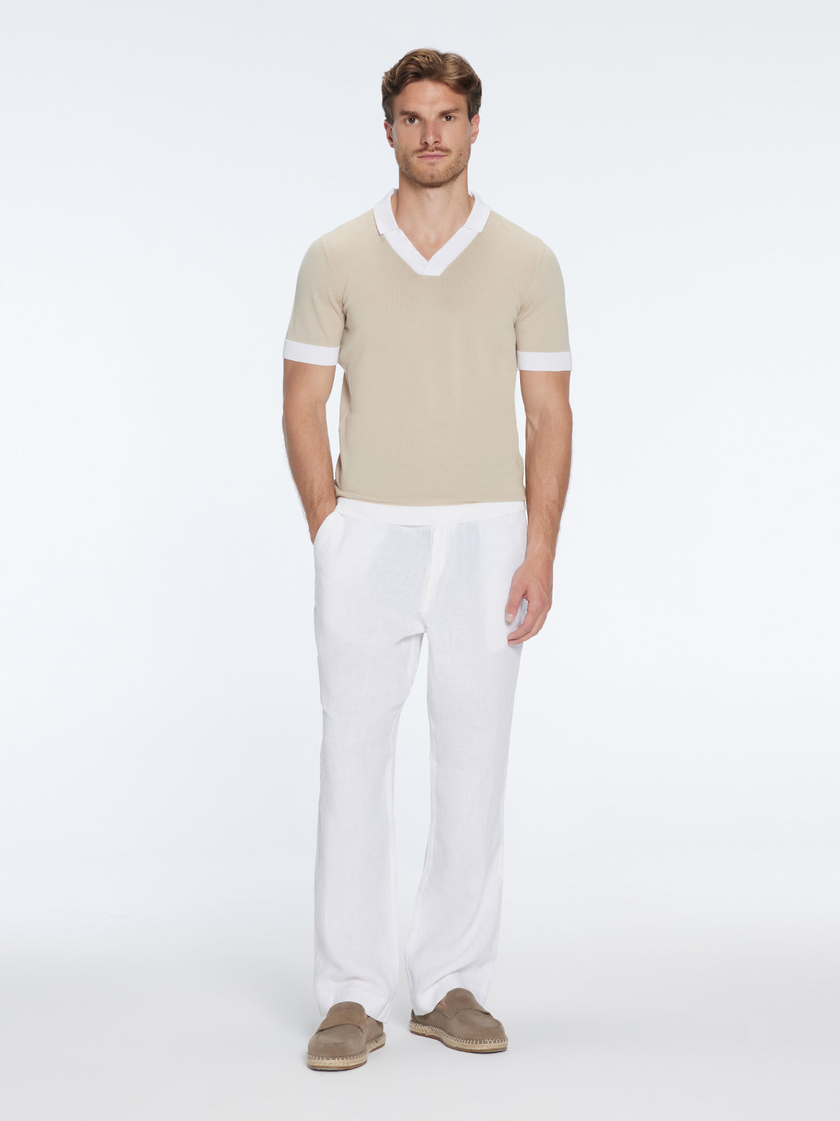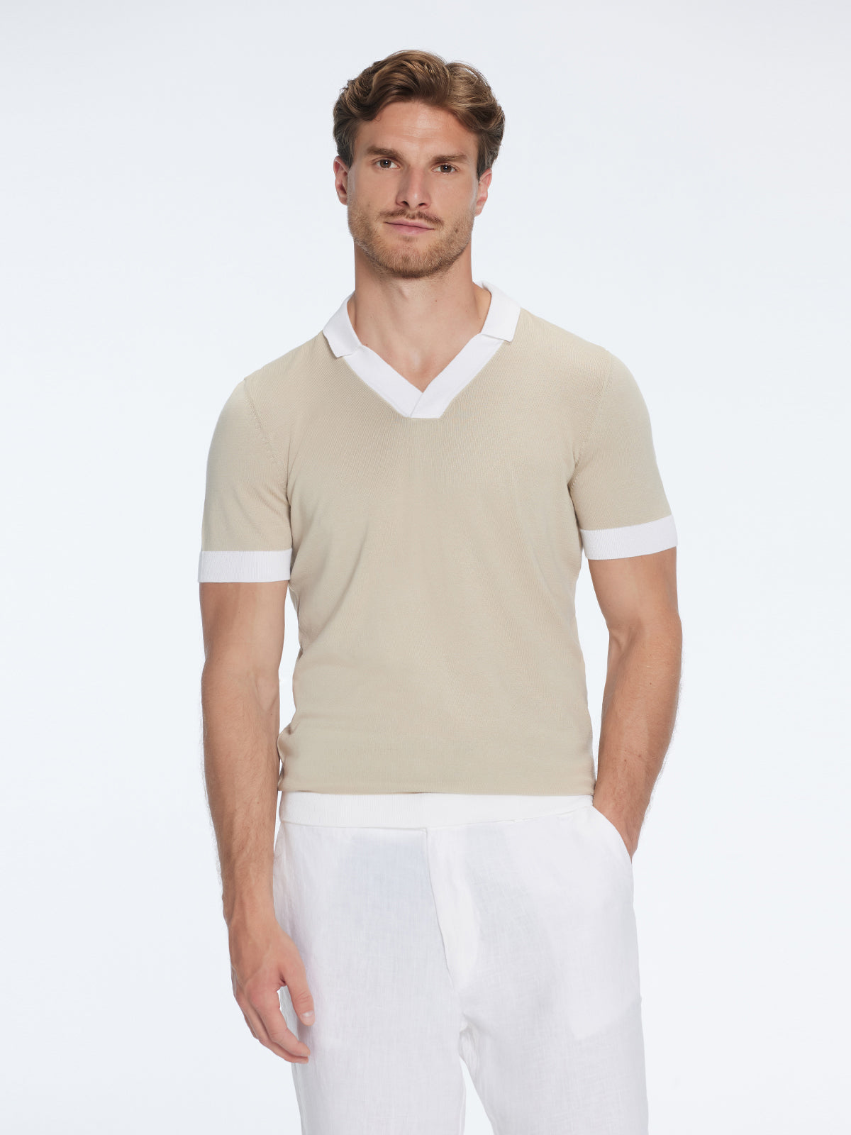 Troy Nude/White V-Neck T-Shirt with Contrast Trim