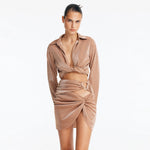 Indigo bronz üst etek ve Greta bronz üst gömlek birlikte şık ve tarz bir plaj kıyafeti oluşturur. Greta gömlek, mayo kumaşından yapılmış kısa silüeti ve uzun kollu bluz stiliyle eteği tamamlar. Öndeki bağcık kıyafete bir sofistikelik dokunuşu katar. Başka bir kombinasyon Nixie bronz bikini üstüyle yapılabilir. Eteğin yüksek belli ve dar kesimi, bikini üstünün bandeau stilini güzel bir şekilde tamamlayacaktır. Üstteki şeffaf cam damla şeklindeki aksesuar detayı, etektekiyle eşleşerek uyumlu bir görünüm yaratır.