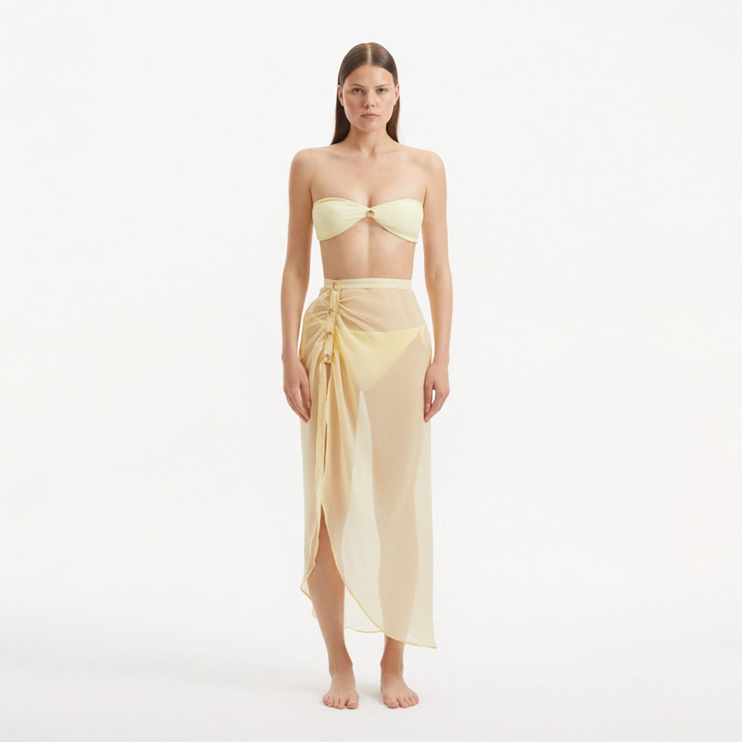 Bu büyüleyici parça, siluetinizi yumuşak bir güneş öpücüğü parıltısıyla sararak ayak bileğine kadar uzanan bir bitişe doğru akar. Uzun, akıcı tasarım, zamansız zarafeti anlatır ve onu gardırobunuz için çok yönlü bir ek yapar. Tasarıma dahil edilen eğlenceli bir yan yırtmaç, bu aydınlık giysiye bir parça merak katar. Yırtmaç, etekte dinamik bir akış yaratır ve attığınız her adımda bulutların arasından geçen bir güneş ışını gibi bir enerji patlaması yaratır. Moeva'nın imzası olan kabuk şeklindeki altın düğmeler, bu ışıltılı parçaya ideal vurgular olarak hizmet eder. Skortu küçük güneşler gibi süsleyerek, canlı sarı kumaşa karşı parlar ve hem lüks hem de göz alıcı bir ışıltı dokunuşu ekler. Xander sarı skort, güneşli bir günün sıcaklığını ve neşesini yansıtan büyüleyici bir giysidir. Çok yönlü tasarımıyla birleşen ışıltılı renk paleti, onu günlük veya resmi her durum için vazgeçilmez bir parça haline getirir. Xander sarı etek etekle altın sarısı ihtişamın tadını çıkarın ve stilinizin güneş gibi parlamasına izin verin.